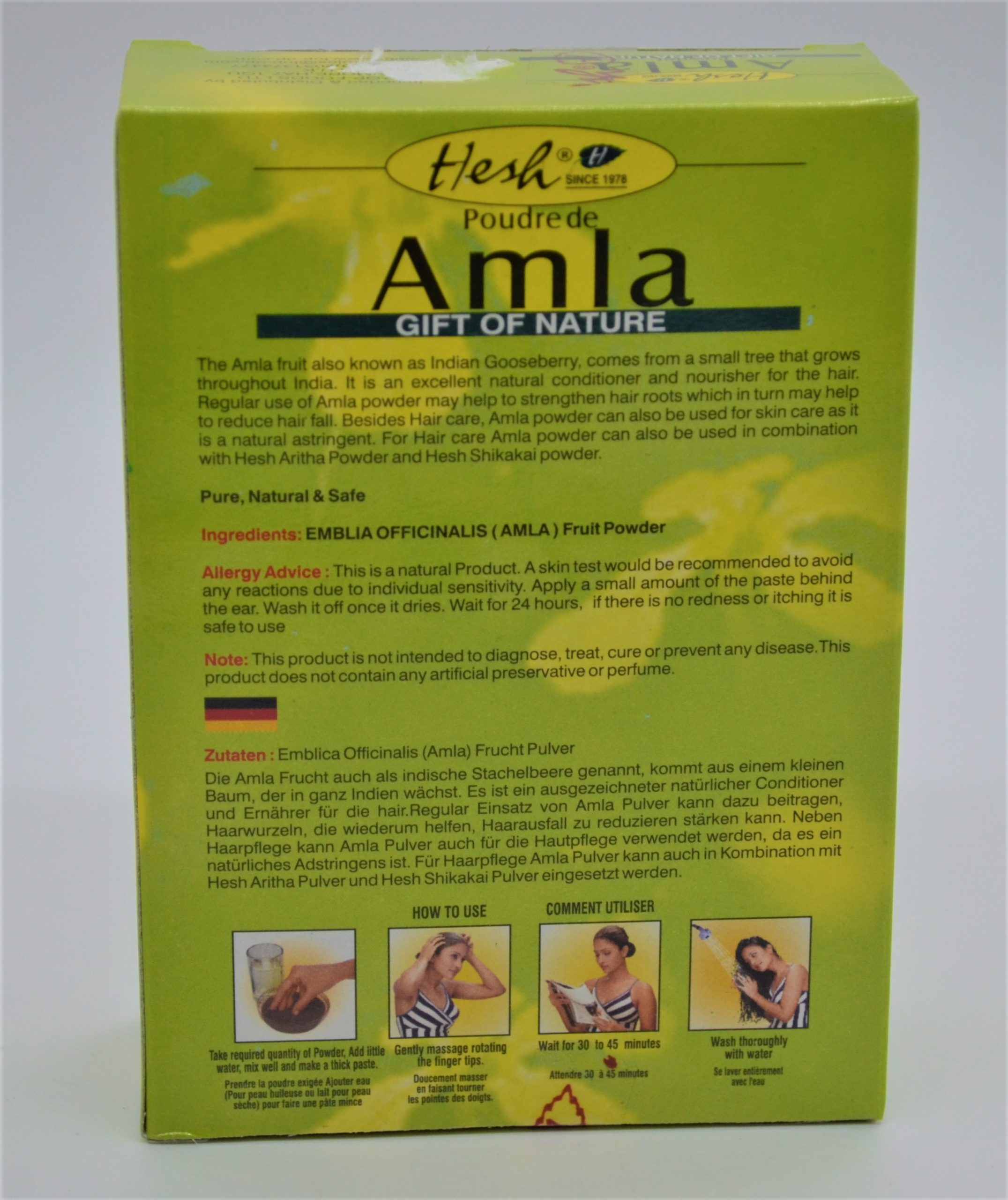 Hesh Parma Amla herbal hair care product. The Amla fruit is also known as the Indian Gooseberry. It is an excellent natural conditioner and nourisher for the hair. Regular use of Amla powder (in a paste form) may help to strengthen hair roots which in turn may help to reduce hair lose.