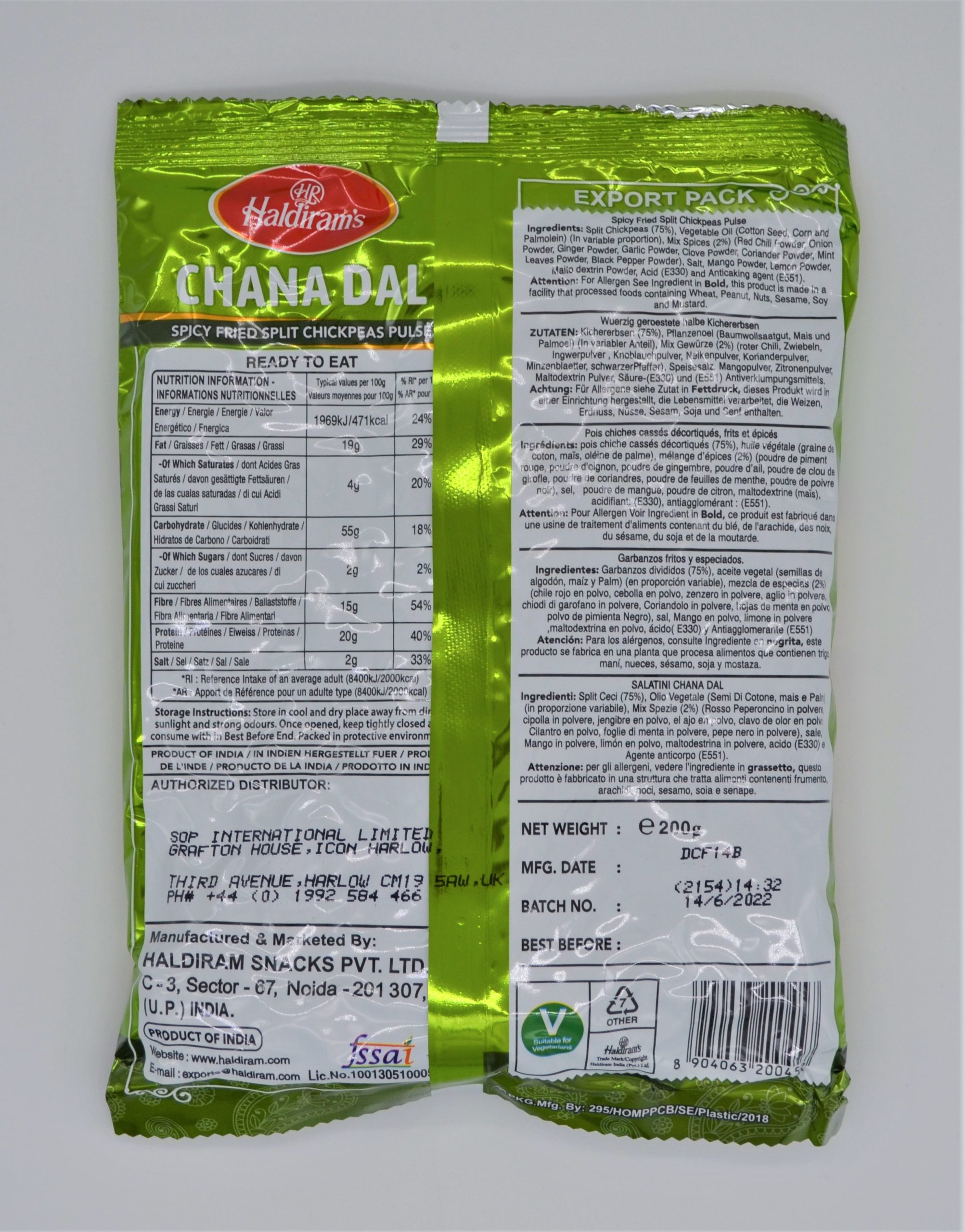 Ingredients: Chickpeas Pulse 75%, Vegetable Oil (Cotton Seed, Corn And Palmolien), Salt, Lemon Powder, Red Chilli Powder, Mango Powder, Onion Powder, Ginger Powder, Garlic Powder, Clove Powder, Coriander Powder, Malto Dextrin Powder, Mint Leaves Powder, Black Pepper Powder, Acidity Regulator.