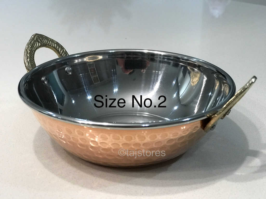 A stainless steal kadai dish with a hammered effect copper base and 2 decorative brass handles. Set an impression with your guests by serving the authentic Indian meal using these traditional dishes.