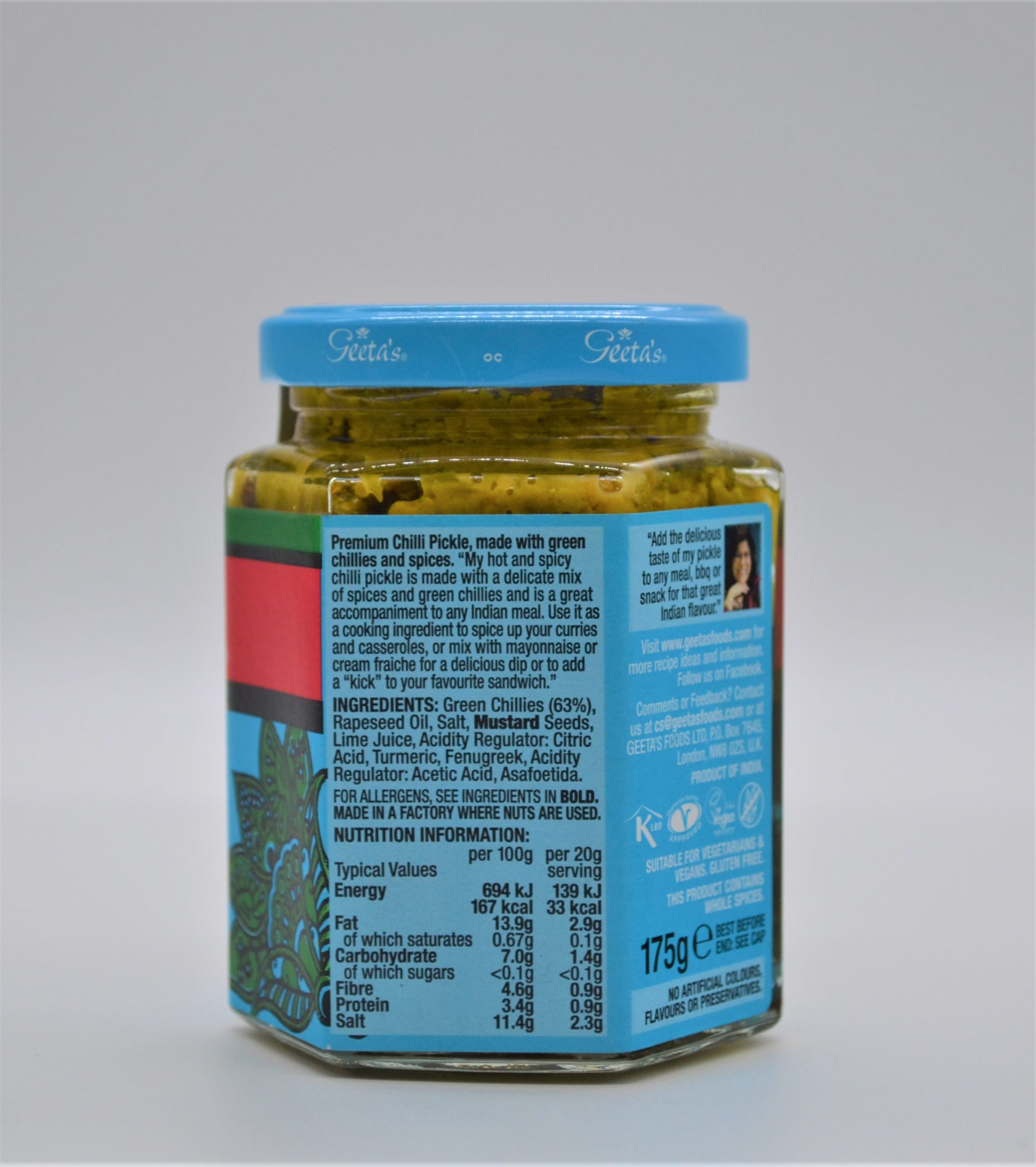 Ingredients: Green Chillies (63%), Rapeseed Oil, Salt, Mustard Seeds, Lime Juice, Acidity Regulator: Citric Acid, Turmeric, Fenugreek, Acidity Regulator: Acetic Acid, Asafoetida