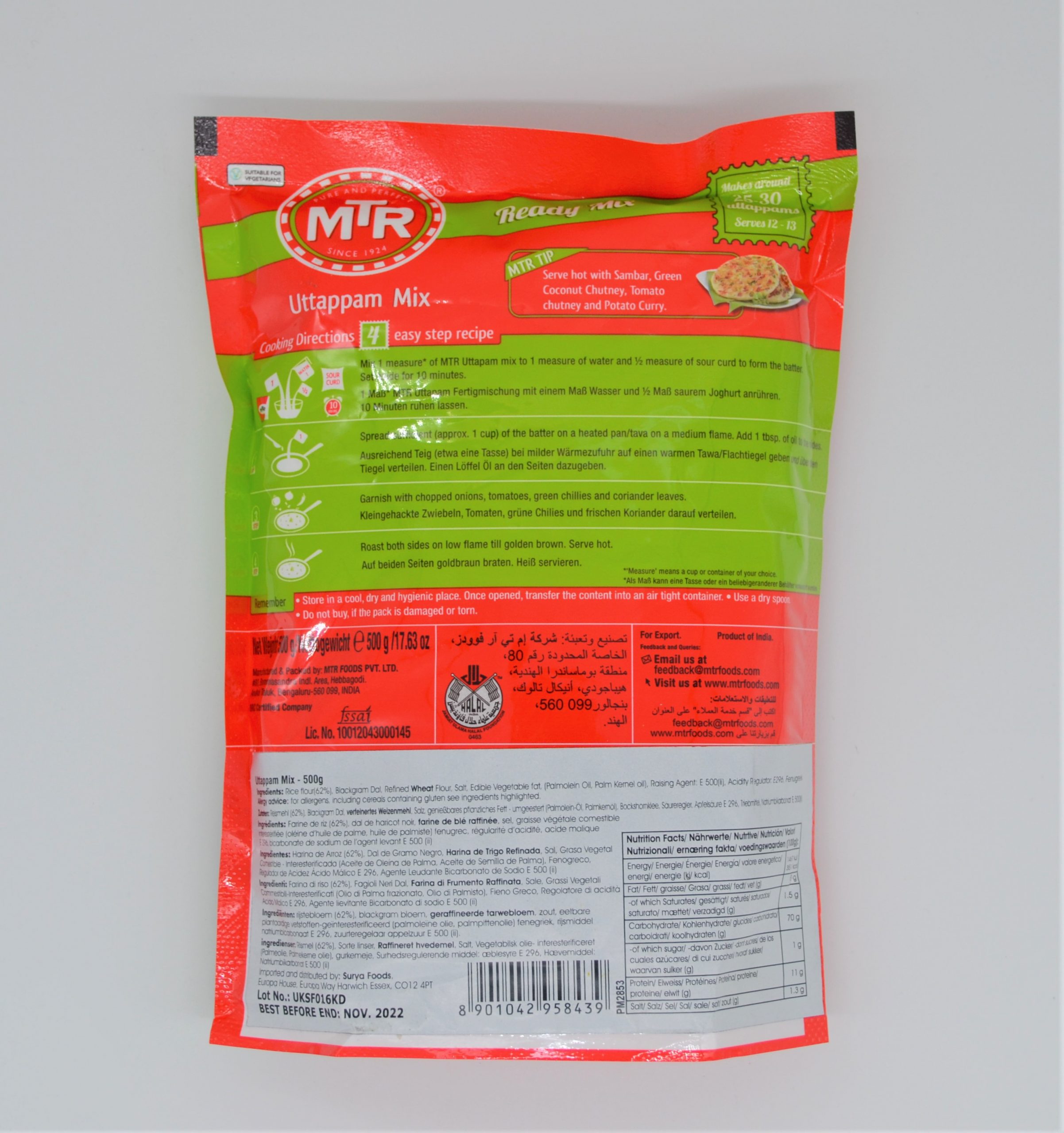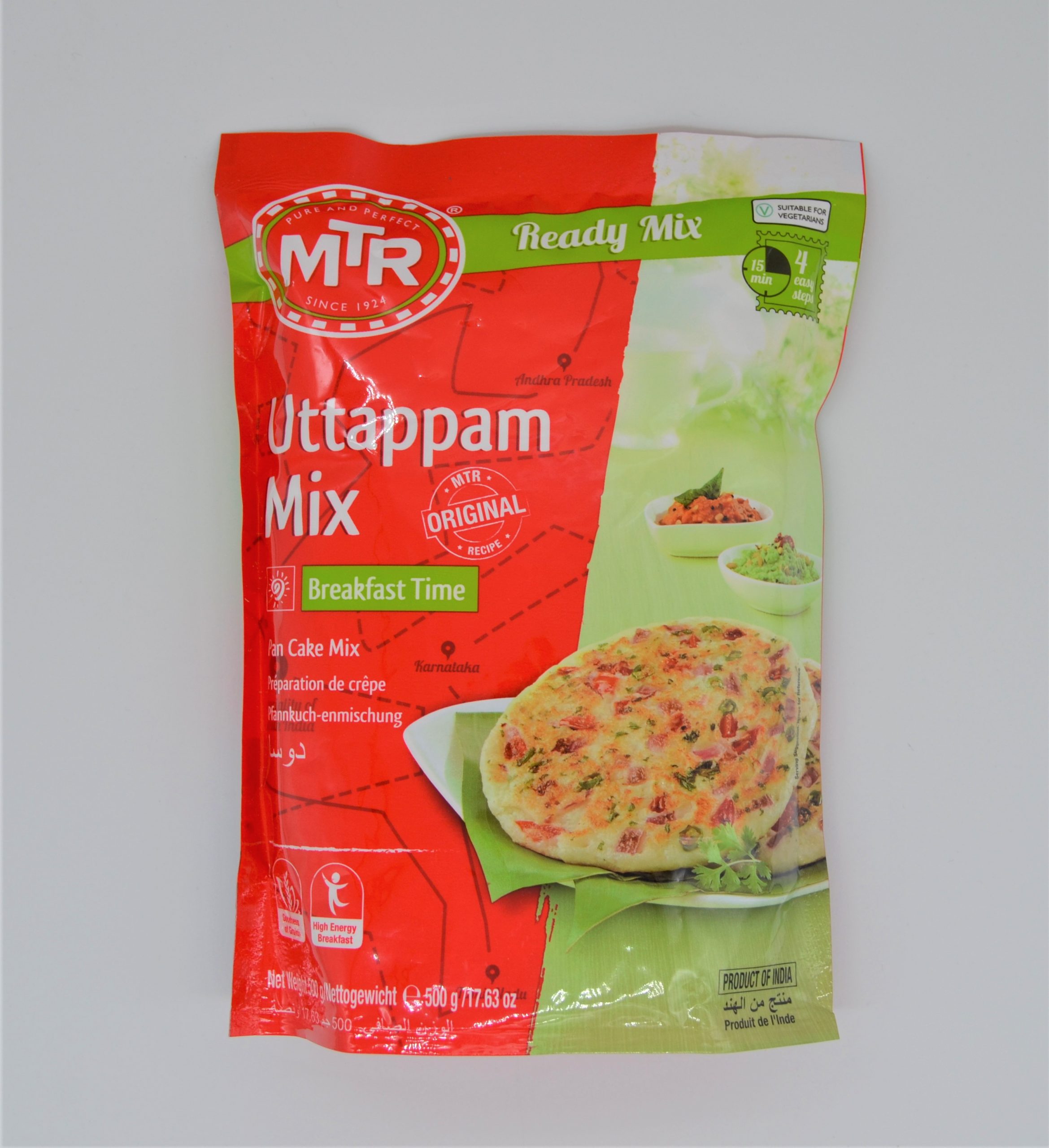 MTR ready to cook Uttappam (spicy South Indian crepe) instant mix. MTR brand is the contemporary way to authentic tasting Indian vegetarian food. Using the highest quality authentic ingredients and traditional methods to bring you the purest and unmatched flavour and taste to delight your family at every meal times.